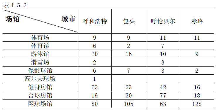 20世紀50年代,內(nèi)蒙古自治區(qū)在呼和浩特市公園西路建設(shè)了自治區(qū)第—個綜合體育場―呼和浩特市人民體育場(大馬路體育場)。1977年,在呼和浩特新華西街建設(shè)了第一個體育館,內(nèi)蒙古體育館。之后自治區(qū)主要城市相繼建了一批體育場館,但規(guī)模不大,設(shè)備簡陋。1978年之后,自治區(qū)體育館健身場得到快速發(fā)展。2004年末,全區(qū)有各種體育場館1.5萬個。可為游客提供體育健身活動的場館主要有:體育館20個、游泳館100個(室內(nèi)游泳池49個、室外游泳池51個)、滑雪場9個(非標準5個)、輪滑場17個、高爾夫球場3個、健身房館215個、臺球房館186個、網(wǎng)球場館621個(室內(nèi)25個)。