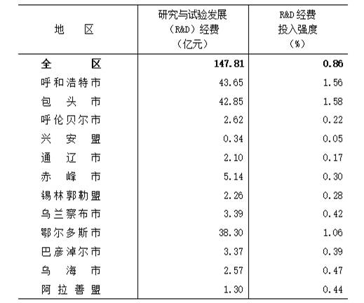 分地區(qū)看,研究與試驗發(fā)展(R&D)經(jīng)費投入超過35億元的盟市有3個,分別是呼和浩特市(43.65億元)、包頭市(42.85億元)和鄂爾多斯市(38.30億元)。研究與試驗發(fā)展(R&D)經(jīng)費投入強度(與地區(qū)生產(chǎn)總值之比)超過全區(qū)平均水平的盟市有3個,分別為包頭市、呼和浩特市和鄂爾多斯市(詳見附表2)。