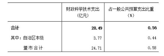 2019年,全區(qū)財政科學(xué)技術(shù)支出28.49億元,比2018年增加2.44億元,增長9.35%,占一般公共預(yù)算支出的比重為0.56%。其中,自治區(qū)本級財政科學(xué)技術(shù)支出3.77億元,占本級一般公共預(yù)算支出比重0.44%;盟市財政科學(xué)技術(shù)支出24.71億元,占盟市一般公共預(yù)算支出比重為0.58%[4]。