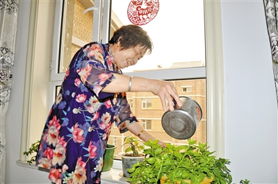 王金秀在侍弄自己的花草。