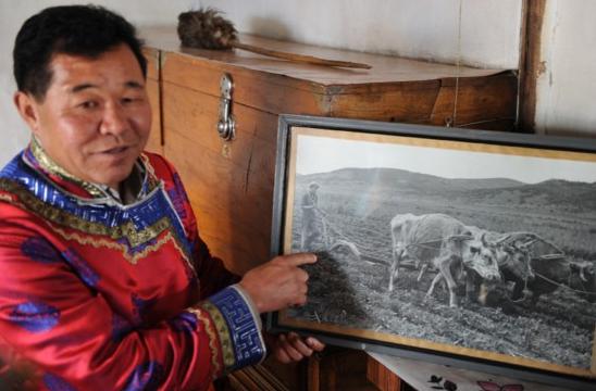 敖敦林由衷的感謝政府的好政策,他特意帶著記者參觀之前住過的低矮的老屋子,那是一座已經(jīng)承受了60年風(fēng)雨的舊居,和現(xiàn)在窗明幾凈的新房形成鮮明對(duì)比。老屋子中擺放著他父親的舊照,是一張?jiān)谔镩g勞作的照片,那時(shí)候還保留著原始的耕種方式,遠(yuǎn)不及現(xiàn)在的便利。