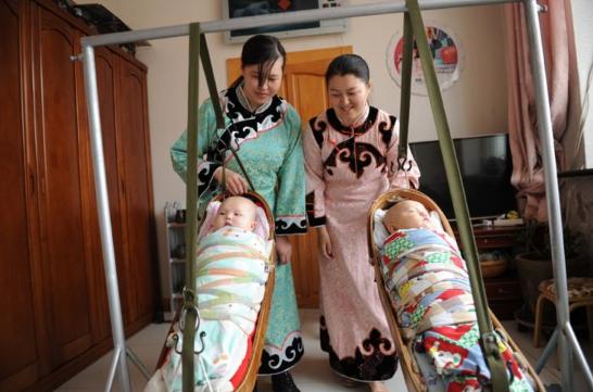 敖敦林的兩個(gè)兒媳婦在用傳統(tǒng)木床哄孩子,一家人生活幸福美滿