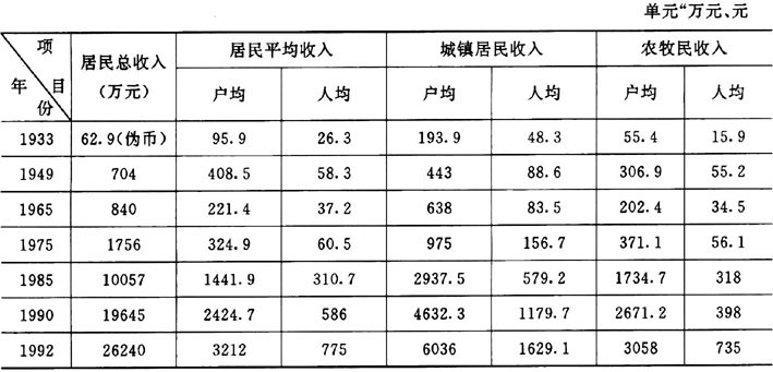偽滿大同2年(1933年),旗內城鎮(zhèn)居民1915戶,7690人,總收入371 427元(偽幣),戶均193.9元,人均48.3元。1949年,城鎮(zhèn)居民2201戶,11 002人,總收入97.6萬元(折新人民幣),戶均443元,人均88.6元。1990年,城鎮(zhèn)居民50戶收入調查,戶均4632.3元,人均1179.7元。在人均收入中,職工工資收入767元,從單位獲得福利收入66元,其它勞動收入13.5元,財產(chǎn)性收入7.7元,轉移性收入112.5元,贈送親友搭伙、出售財產(chǎn)收入47.4元,借貸性收入165.3元。199250戶收入調查,戶均收入6036元,是1933年的31.13倍,1949年的13.6倍;人均收入1629.2元,是1933年的33.7倍,1949年的24.5倍。在人均收入中,職工工資收入1090.9元,其它勞動收入9.1元,從單位獲得福利收入87.4元,財產(chǎn)性收入5.5元,轉移性收入68.6元,家庭副業(yè)收入4.6元,儲蓄借貸收入363.1元。