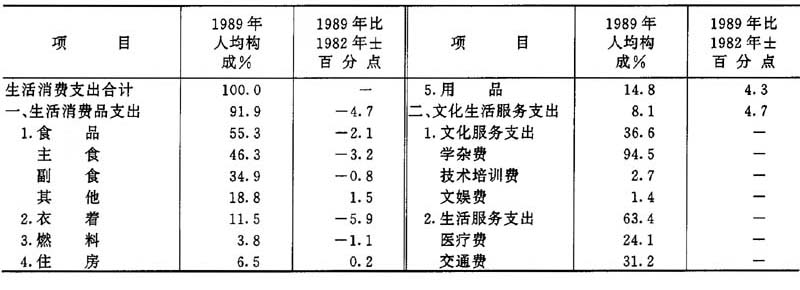 1978年以前口糧基本以粗糧為主,細(xì)糧和主要副食品所占比重有限。1989年,農(nóng)民人均消費(fèi)糧食269公斤,其中細(xì)糧占50%以上。在主要副食品中,人均消費(fèi)豬牛羊肉13.4公斤,食糖0.8公斤、蛋類3.0公斤、家禽0.8公斤、蔬菜218公斤、植物油3.8公斤、水果3.0公斤、酒6.6公斤、卷煙11.8盒。在衣著方面由只講便宜、耐穿到講究款式、顏色、面料,式樣逐漸趨于城市化。全年人均購買棉布1.79米、化纖布1.39米、呢絨布0.18米、各類服裝0.76件、皮鞋0.12雙、膠鞋0.64雙、棉花0.19公斤。在日用品方面,高檔、實(shí)用的消費(fèi)品備受青睞。農(nóng)民人均居住面積由1982年的9.6平方米增加到1989年的12.62平方米,房屋結(jié)構(gòu)由以土坯為主向磚木、鋼筋混凝土方向發(fā)展。
