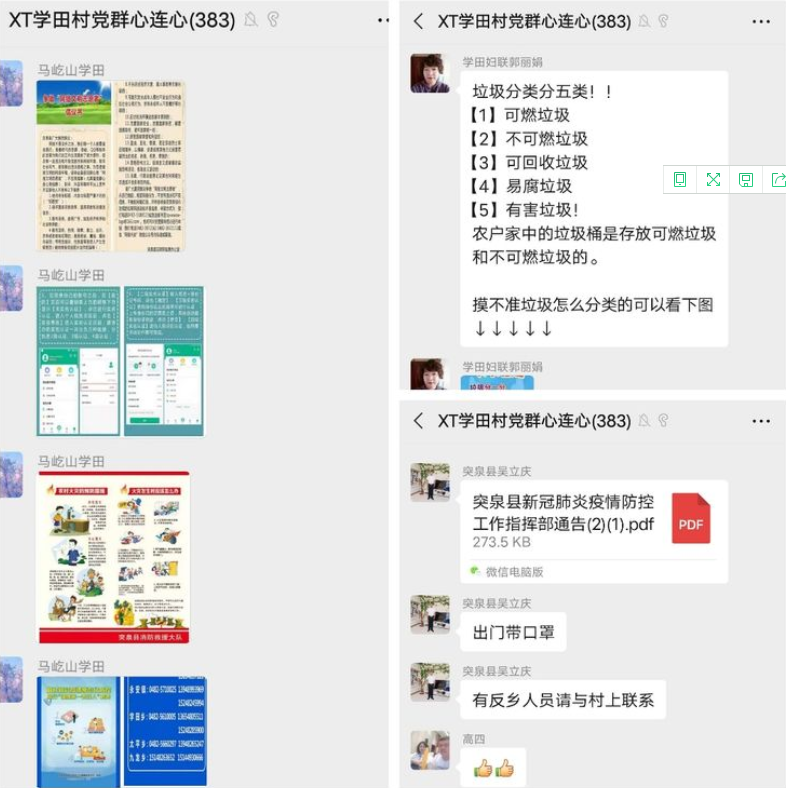 學(xué)田村利用黨群心連心微信群對(duì)牧業(yè)再造突泉工程、垃圾分類、法律知識(shí)、疫情防控、消防知識(shí)、網(wǎng)絡(luò)文明等內(nèi)容進(jìn)行宣傳,通過微信群創(chuàng)新宣講方式、延伸宣講觸角,宣講好理論政策。