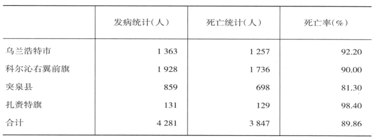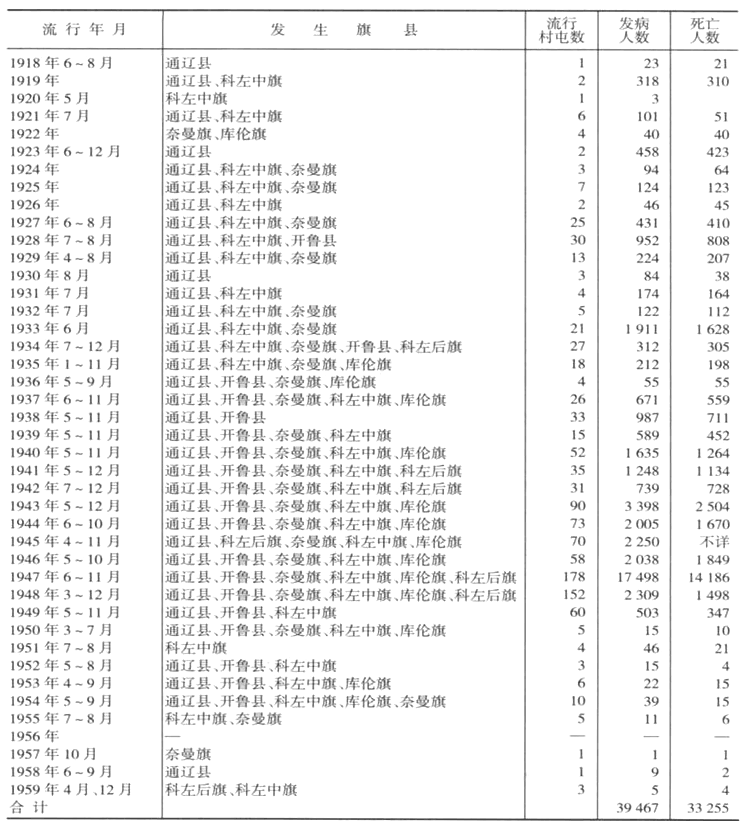 1930年后,哲里木地區(qū)鼠疫流行連年頻發(fā),最終導(dǎo)致了1947年整個哲里木地區(qū)的鼠疫暴發(fā)流行。疫區(qū)遍及哲里木盟的通遼縣、奈曼旗、科左中旗、開魯縣、庫倫旗、科左后旗、扎魯特旗,疫點(diǎn)多達(dá)178處,發(fā)病17 498人。19個村屯因之成為廢墟,316戶人家被鼠疫吞噬,全家滅絕。從1918—1959年,整個哲里木地區(qū)鼠疫發(fā)病39 746人,死亡33 255人。