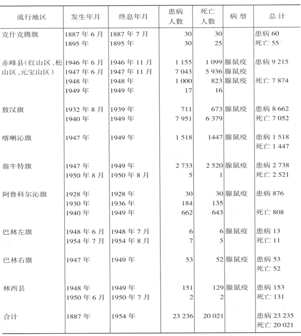 在赤峰范圍內(nèi),1887—1954年,該地區(qū)有24個年度發(fā)生過鼠疫的人間流行。疫情波及該市的克什克騰旗、阿魯科爾沁旗、敖漢旗、赤峰縣、翁牛特旗、喀喇沁旗、巴林右旗、林西縣、巴林左旗等9個旗縣(1949年以前的區(qū)劃)509個村屯,總計(jì)死亡20 021人。