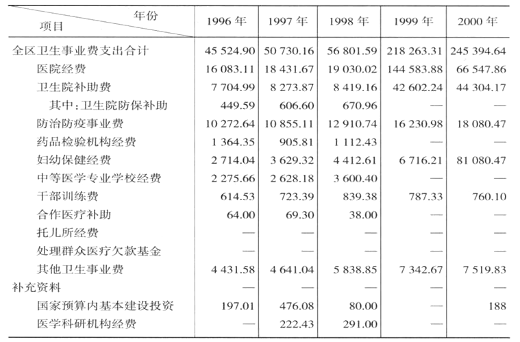 1996—2000年全區(qū)衛(wèi)生事業(yè)經(jīng)費支出分類表
