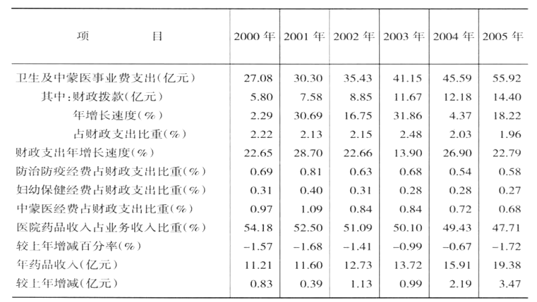 中華人民共和國成立前,內蒙古自治區(qū)衛(wèi)生事業(yè)經(jīng)費支出最多的一年只有42.4萬元(1949)。中華人民共和國成立后的1950年增長為141.4萬元。1953年,全區(qū)衛(wèi)生事業(yè)經(jīng)費支出達到了2567.9萬元。1959年以后,在2500萬元至5000萬元之間。1979年,突破1億元。1986年達到了2.6億多元。1999年和2000年分別超過了20個億。“十五”期間,隨著國家和自治區(qū)對衛(wèi)生的投入不斷加大,各項衛(wèi)生政策逐步得到完善和落實,衛(wèi)生事業(yè)得到很大的發(fā)展,用于衛(wèi)生發(fā)展的經(jīng)費支出由2000年的27.08億元增長到2005年的55.92億元,年均增長速度達到15.60%,人均衛(wèi)生事業(yè)費達到174.18元,藥品占醫(yī)院收入的比重由2000年的54.18%下降到2005年的47.17%。