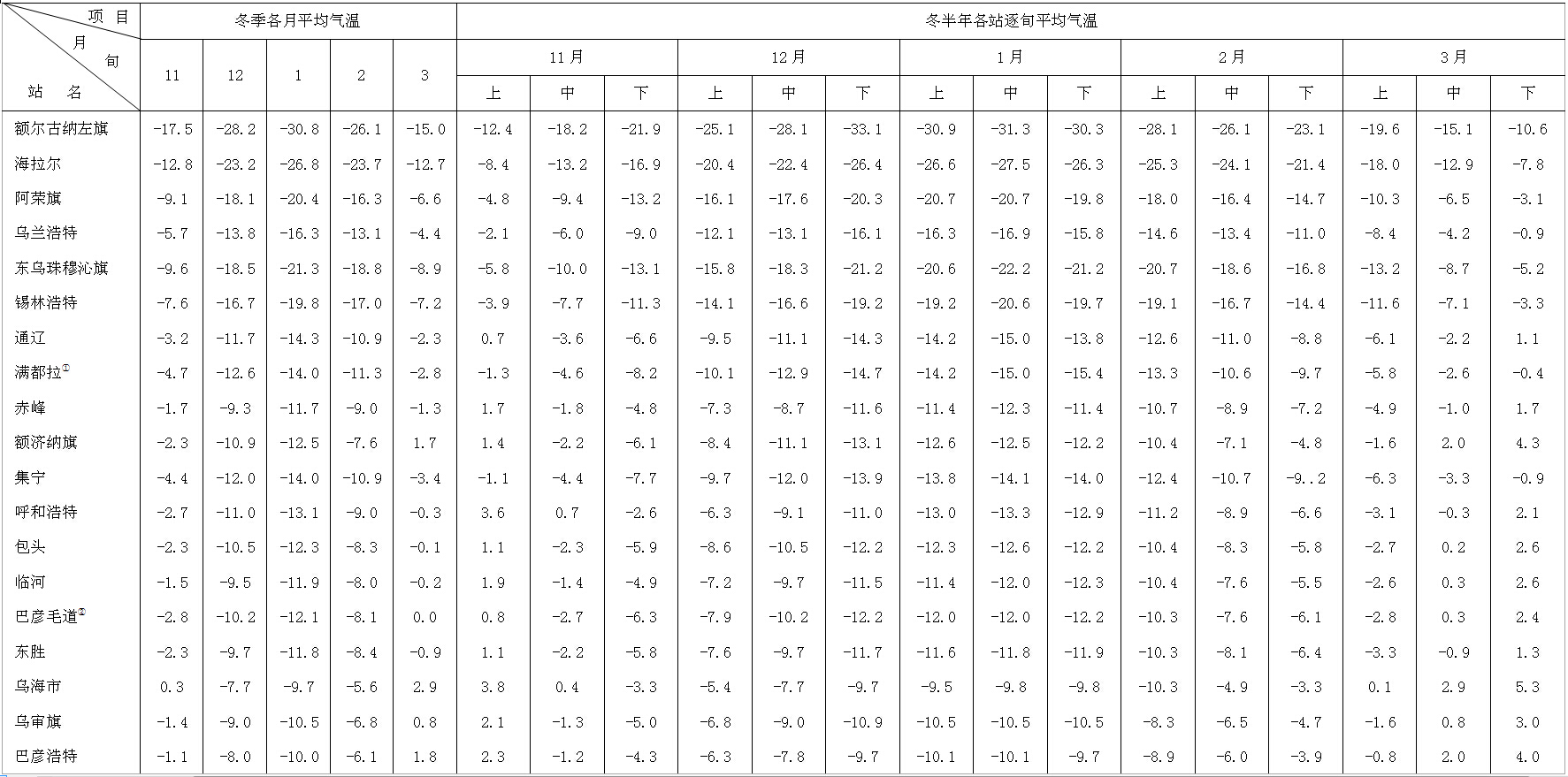 表1-2-1續(xù)內(nèi)蒙古自治區(qū)氣溫年變化表(冬季)