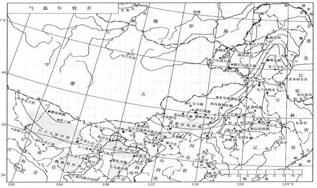 內(nèi)蒙古自治區(qū)各地氣溫年較差較大,總的分布形勢是北大南小,等年較差40℃線,由阿榮旗經(jīng)牙克石市博克圖、蘇格河,科右前旗阿爾山東部、西烏珠穆沁旗西部、克什克騰旗的白音敖包、阿巴嘎旗巴彥郭勒到二連浩特。40℃線以北地區(qū)氣溫年較差在40℃以上,最北部地區(qū)在46℃以上;40℃線以南地區(qū)氣溫年較差在32℃~39℃之間,赤峰市南部、伊盟南部、阿盟南部的部分地區(qū)是內(nèi)蒙古自治區(qū)氣溫年較差較小的地區(qū),為32℃~34℃。氣溫年較差最大的地區(qū)是陳巴爾虎旗(48℃),位居全國第三,比第一位的黑龍江邊嘉蔭(49.2℃)僅低1.2℃。氣溫年較差最小的是鄂托克前旗(32.2℃),比全國氣溫年較差最小的西沙氣象站(6.1℃)高26.1℃。(詳見圖1-2-1)