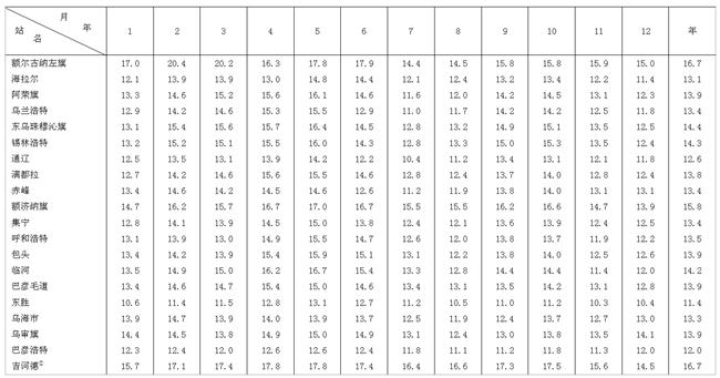 表1-2-2內(nèi)蒙古地區(qū)氣溫日較差年變化表
