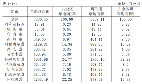 按行政區(qū)劃劃分,錫林郭勒盟草地面積最大,為1952萬公頃,占草地總面積的24.8%;其次是阿拉善盟,草地面積1753.5萬公頃,占草地總面積的22.3%;呼倫貝爾盟(今呼倫貝爾市)居第三位,草地面積1129.8萬公頃,占草地總面積的14.3%。