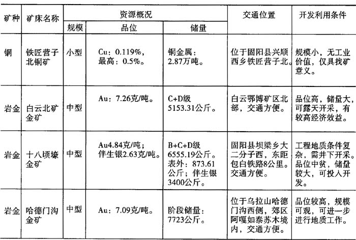 銅礦:主要分布在大青山(沉積含銅砂巖)和固陽北部(含銅石英脈)地區(qū)。共發(fā)現(xiàn)銅礦產(chǎn)地11處,探明儲量(金屬量)2.87萬噸。