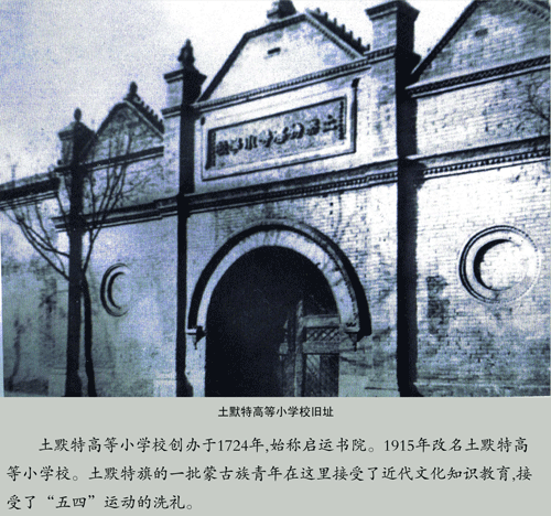 1919年“五四運(yùn)動(dòng)在北京爆發(fā),消息傳到歸綏(今呼和浩特)后,土默特高等小學(xué)、歸綏高等小學(xué)校、歸綏中學(xué)的師生積極行動(dòng)起來,響應(yīng)北京學(xué)生的愛國運(yùn)動(dòng),各校紛紛舉辦座談會(huì),并成立了學(xué)生會(huì),于5月中下旬舉行了罷課和示威游行。500多名師生走上街頭,高喊口號,張貼標(biāo)語傳單,對群眾演講。在青年學(xué)生的愛國行動(dòng)影響下,綏遠(yuǎn)總商會(huì)也向全國發(fā)出通電聲援學(xué)生運(yùn)動(dòng)。“五四運(yùn)動(dòng)的浪潮,震撼了塞外邊陲,喚醒了人民群眾的愛國熱情,揭開了內(nèi)蒙古地區(qū)新民主主義革命的序幕。