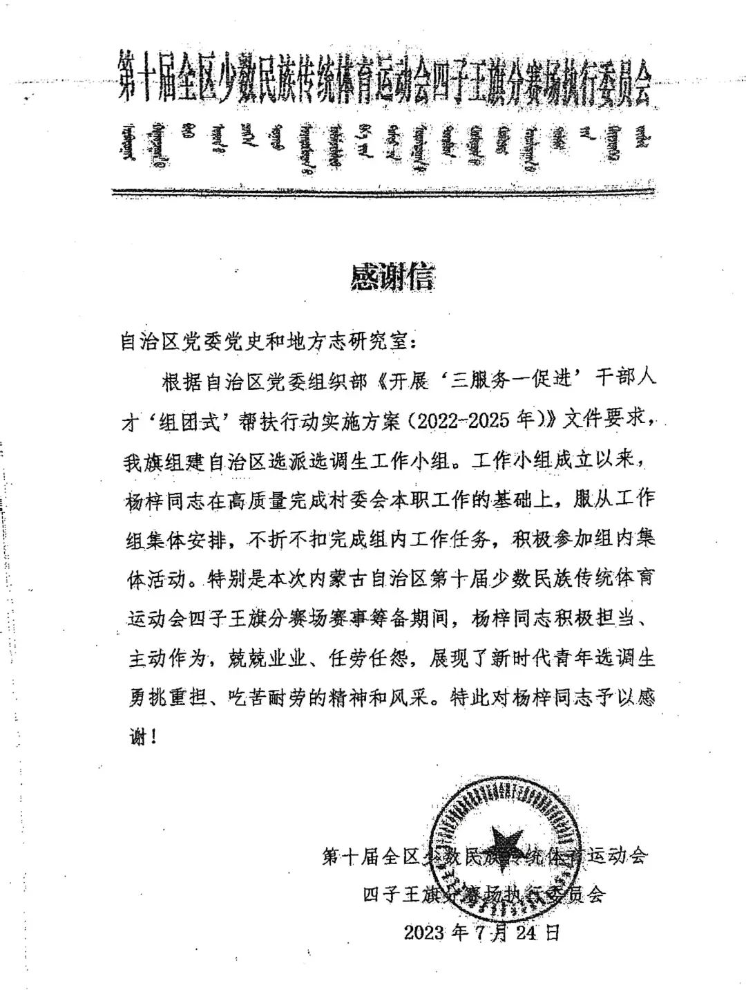 近日,第十屆全區(qū)少數(shù)民族傳統(tǒng)體育運(yùn)動(dòng)會(huì)四子王旗分賽場執(zhí)行委員會(huì)致函我室。信中對我室掛職干部楊梓在參加第十屆全區(qū)少數(shù)民族傳統(tǒng)體育運(yùn)動(dòng)會(huì)期間積極擔(dān)當(dāng)、主動(dòng)作為的優(yōu)秀表現(xiàn)予以稱贊和感謝。