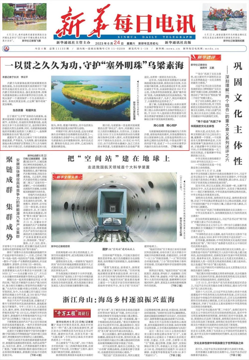 6月24日,《新華每日電訊》頭版刊發(fā)《一以貫之久久為功,守護(hù)“塞外明珠”烏梁素海》。報(bào)道全文如下: