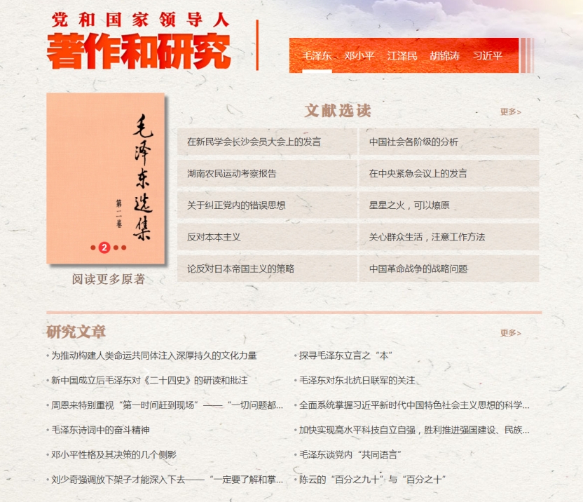 “黨和國家領(lǐng)導(dǎo)人著作和研究”欄目收入《毛澤東選集》《鄧小平文選》《江澤民文選》《胡錦濤文選》《習(xí)近平著作選讀》等著作中的重要講話、報(bào)告和文章以及相關(guān)研究成果。