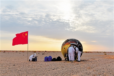 返回艙著陸后,國旗手馮毅在返回艙旁插下了一面國旗,迎風(fēng)飄揚(yáng)的五星紅旗成為茫茫戈壁上一道亮麗風(fēng)景。“在東風(fēng)著陸場升起國旗,特別光榮。為我國的航天事業(yè)點(diǎn)贊!”馮毅難掩興奮。
