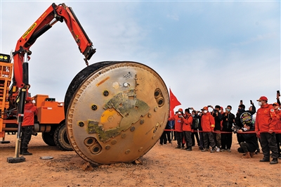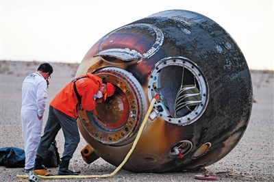 6月4日,工作人員正在處置神舟十五號(hào)載人飛船返回艙。