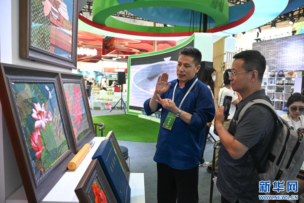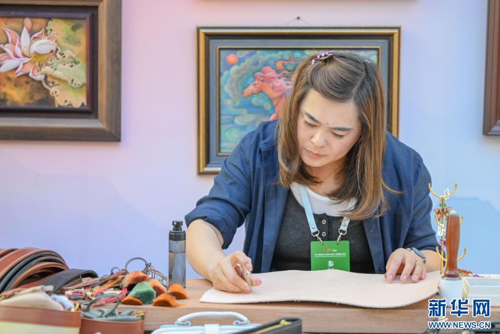 8月29日,一位皮畫非遺傳承人在通遼展區(qū)內(nèi)現(xiàn)場創(chuàng)作。