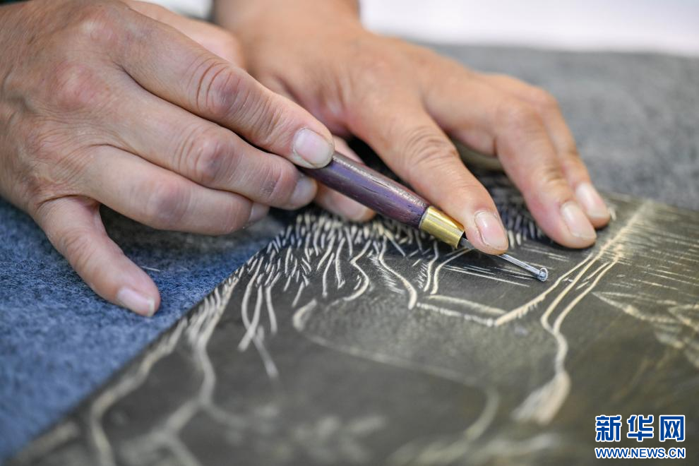 8月29日,一位版畫非遺傳承人在通遼展區(qū)內(nèi)現(xiàn)場創(chuàng)作。