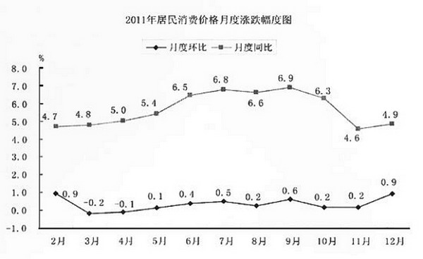 全年居民消費(fèi)價(jià)格總水平比上年上漲5.6%。分城鄉(xiāng)看,城市上漲5.5%,農(nóng)村牧區(qū)上漲5.7%。分類別看,八大類全部呈現(xiàn)上漲局面,其中食品類價(jià)格上漲13.7%,煙酒及用品類價(jià)格上漲2.9%,醫(yī)療保健及個(gè)人用品類價(jià)格上漲2.3%,居住類價(jià)格上漲4.7%。從生產(chǎn)者角度看,工業(yè)生產(chǎn)者購進(jìn)價(jià)格指數(shù)和工業(yè)生產(chǎn)者出廠價(jià)格指數(shù)分別比上年上漲6.1%和7.8%。固定資產(chǎn)投資價(jià)格上漲6.3%,農(nóng)產(chǎn)品生產(chǎn)價(jià)格上漲12.8%。