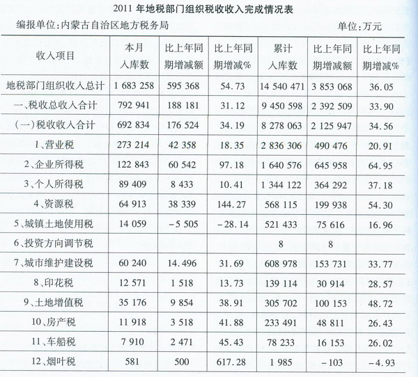 2011年,全區(qū)地稅系統(tǒng)各項收入完成1 454.05億元,比上年同期增加385.31億元,增長36.05%。其中,稅收總收入完成945.06億元,比上年同期增加239.25億元,增長33.9%,完成年度計劃的114.44%。社會保險費完成375.75億元,比上年同期增加101.41億元,增長36.96%,完成年度計劃的123.2%。煤炭價格調(diào)節(jié)基金完成111.74億元,水利建設(shè)基金完成16.85億元,工會經(jīng)費完成1.93億元,殘疾人就業(yè)保障金完成2.26億元,文化事業(yè)建設(shè)費完成0.46億元。