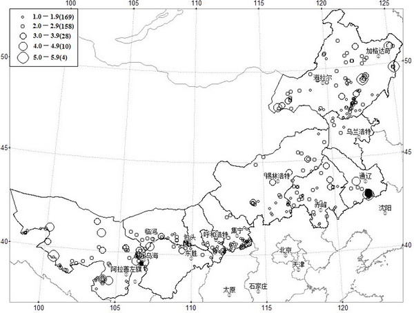 發(fā)生3次中強(qiáng)地震 通遼市科爾沁左翼后旗(北緯 42°56′,東經(jīng)122°23′)4月22日發(fā)生的Ms5.3級地震,震源深度11km。內(nèi)蒙古呼倫貝爾市莫力達(dá)瓦達(dá)斡爾族自治旗、黑龍江省黑河市嫩江縣交界(北緯 49°48′,東經(jīng)125°12′)6月20日發(fā)生的Ms5.0級地震,震源深度6km。內(nèi)蒙古阿拉善盟阿拉善右旗、甘肅省張掖市甘州區(qū)交界(北緯39°25′度,東經(jīng)100°42′度)9月17日發(fā)生Ms4.9級地震,震源深度6km。