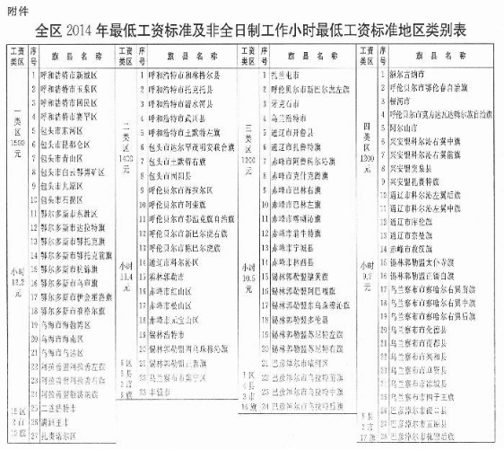 一類地區(qū):呼和浩特市新城區(qū)等15個(gè)區(qū),二連浩特市等2個(gè)計(jì)劃單列市和阿拉善左旗等10個(gè)旗,最低工資標(biāo)準(zhǔn)為1500元/月,非全日制工作小時(shí)最低工資標(biāo)準(zhǔn)為12.2元/小時(shí)。