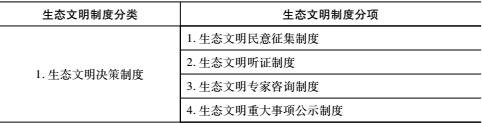 生態(tài)文明決策制度。生態(tài)文明決策制度是指在經(jīng)濟(jì)社會發(fā)展的重大決策中,始終將生態(tài)環(huán)境保護(hù)置于決策前提和基礎(chǔ)地位,堅持民主決策、社會認(rèn)同的原則,在優(yōu)化產(chǎn)業(yè)布局、實(shí)施結(jié)構(gòu)調(diào)整等重大經(jīng)濟(jì)活動中從決策源頭上控制資源環(huán)境問題的產(chǎn)生。包括生態(tài)文明民意征集、生態(tài)文明聽證、生態(tài)文明專家咨詢和生態(tài)文明重大事項公示共4項制度。
