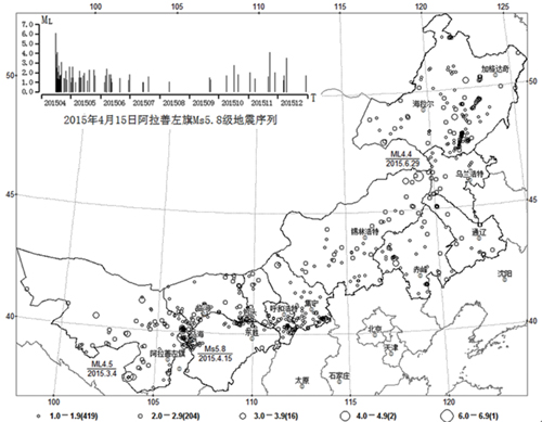 震情 2015年,內(nèi)蒙古自治區(qū)發(fā)生ML≥1.0級地震642次。其中,ML1.0~1.9級地震419次,ML2.0~2.9級地震204次,ML3.0~3.9級地震16次,ML4.0~4.9級地震2次,ML6.0~6.9級地震1次。最大地震是2015年4月15日15時39分發(fā)生在阿拉善左旗(北緯39°46′,東經(jīng)106°22′)的Ms5.8(ML6.1)級地震。次大地震是2015年3月4日發(fā)生在阿拉善左旗(北緯38°02′,東經(jīng)103°42′)的ML4.5級地震。以上地震次數(shù)統(tǒng)計均為可定位地震,而且不包含阿拉善左旗Ms5.8級地震的余震序列。2015年4月15日阿拉善左旗Ms5.8級地震的余震:截至2015年12月31日24時,共計發(fā)生余震136次。其中,ML0.1~0.9級4次,ML1.0~1.9級99次,ML2.0~2.9級26次,ML3.0~3.9級4次,ML4.0~4.9級3次,最大余震為4月15日15時44分發(fā)生的ML4.5級地震。2015年發(fā)生ML≥3.0級地震19次,2014年發(fā)生ML≥3.0級地震47次,地震活動頻度水平減少。但是,2015年發(fā)生Ms5.8級中強地震,地震強度明顯增強,而2014年未發(fā)生中強地震,其最大地震是2014年4月20日呼倫貝爾市鄂倫春自治旗ML4.8級地震。10月13—16日,自治區(qū)地震局在呼和浩特市召開2015年度全區(qū)地震趨勢會商會。會議組織與會專家和分析預(yù)報人員對2016年度內(nèi)蒙古自治區(qū)地震趨勢判定、短臨預(yù)報工作思路及重點監(jiān)視區(qū)強化跟蹤措施進行了認(rèn)真的討論,確定了1個地震重點監(jiān)視區(qū)和3個值得注意地區(qū)。8月22—24日,在通遼市組織召開“遼蒙”交界區(qū)工作會議;8月27—29日,在呼和浩特市組織召開“晉冀蒙”交界區(qū)工作會議;9月22—24日,在烏海市組織召開“蒙寧”交界區(qū)工作會議,強化重點危險區(qū)震情跟蹤工作。