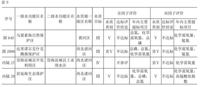 2017年,主要湖泊按全因子評價:烏梁素海水質(zhì)為Ⅴ類,主要超標(biāo)項目為總氮、化學(xué)需氧量、總磷;達里諾爾湖水質(zhì)為劣Ⅴ類,主要超標(biāo)項目為總磷、總氮、化學(xué)需氧量;居延海水質(zhì)為Ⅴ類,主要超標(biāo)項目為化學(xué)需氧量、總磷、總氮。按雙因子評價:烏梁素海水質(zhì)為Ⅴ類,主要超標(biāo)項目為化學(xué)需氧量、氨氮;達里諾爾湖水質(zhì)為劣Ⅴ類,主要超標(biāo)項目為化學(xué)需氧量、氨氮;岱海水質(zhì)為劣Ⅴ類,主要超標(biāo)項目為化學(xué)需氧量;居延海水質(zhì)為Ⅴ類,主要超標(biāo)項目為化學(xué)需氧量、高錳酸鹽指數(shù)。2017年水功能區(qū)水質(zhì)與2016年相比,呼倫湖、岱海水質(zhì)變化不大,烏梁素海全因子水質(zhì)略有好轉(zhuǎn)。