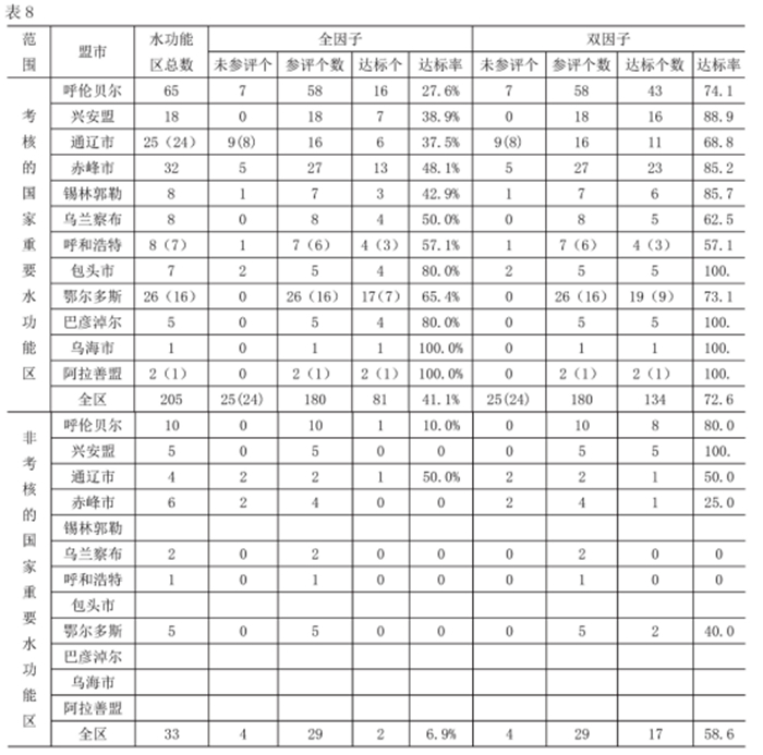 考核的國家重要水功能區(qū)達標(biāo)率情況為:包頭市、巴彥淖爾市、烏海、阿拉善盟為100%,興安盟為88.9%,錫林郭勒盟為85.7%,赤峰市為85.2%,呼倫貝爾市為74.1%,鄂爾多斯市為73.1%,通遼市為68.8%,烏蘭察布市為62.5%,呼和浩特市為57.1%。見表8。