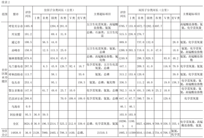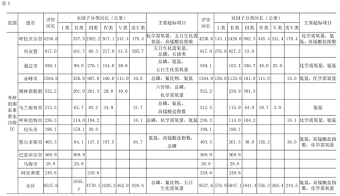 2017年,全區(qū)共監(jiān)測水功能區(qū)560個,實際參加評價的水功能區(qū)437個,有95個水功能區(qū)由于河干、斷流、本底值沒有參加評價,有28個無水質(zhì)目標(biāo)的排污控制區(qū),只進行監(jiān)測,不參與考核。參加評價的河長21510.5公里。按雙因子(指標(biāo)為化學(xué)需氧量、高錳酸鹽指數(shù)、氨氮,下同)評價,水質(zhì)為Ⅰ類~Ⅲ類的水功能區(qū)359個,河長18501.2公里,河長所占比例為86.0%,Ⅳ類~劣Ⅴ類的水功能區(qū)78個,河長3009.3公里,河長所占比例為14.0%。見表5。