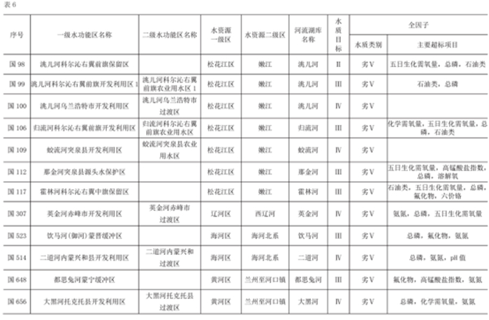 2017年考核的國家重要水功能區(qū)數(shù)量為192個,實際參加評價的水功能區(qū)為168個,有14個水功能區(qū)由于河干、斷流沒有參加評價,另有10個水功能區(qū)由于本底值(根據(jù)松遼水資保〔2016〕38號文件)不參與評價與考核,參加評價的河長9537.6公里。按全因子(根據(jù)《地表水環(huán)境質(zhì)量標(biāo)準(zhǔn)(GB3838-2002)》,全因子為除水溫、總氮、糞大腸菌群以外21項,飲用水源區(qū)增加5項,下同)評價,水質(zhì)為Ⅰ類~Ⅲ類的水功能區(qū)109個,河長6625.8公里,河長所占比例為69.5%,Ⅳ類~劣Ⅴ類的水功能區(qū)59個,河長2911.8公里,河長所占比例為30.5%;按雙因子評價,水質(zhì)為Ⅰ類~Ⅲ類的水功能區(qū)141個,河長8267.4公里,河長所占比例為86.7%,Ⅳ類~劣Ⅴ類的水功能區(qū)27個,河長1270.2公里,河長所占比例為13.3%。