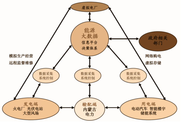 我區(qū)能源信息網(wǎng)應(yīng)以能源大數(shù)據(jù)為核心,由政府主管部門(經(jīng)信委、能源局)、內(nèi)蒙古電力公司、區(qū)內(nèi)發(fā)電企業(yè)、用電客戶四大主體和信息平臺(tái)、虛擬電廠、決策體系三大信息系統(tǒng)構(gòu)成。電力公司和發(fā)電企業(yè)的信息數(shù)據(jù)經(jīng)過能源大數(shù)據(jù)分析,通過互聯(lián)網(wǎng)形成信息平臺(tái)和虛擬電廠。信息平臺(tái)可以為用戶提供電力生產(chǎn)和經(jīng)營(yíng)信息,供用戶了解不同區(qū)域、不同時(shí)段的電量水平、發(fā)電能力、電力價(jià)格等供給側(cè)信息;同時(shí),用戶將市場(chǎng)需求信息反饋至信息平臺(tái),實(shí)現(xiàn)信息共享。信息共享平臺(tái)又將市場(chǎng)供需情況提供給政府主管部門,作為制定各項(xiàng)政策的參考,用以引導(dǎo)電力公司、發(fā)電集團(tuán)和監(jiān)管用電客戶。虛擬電廠是將電廠的建設(shè)、生產(chǎn)、運(yùn)營(yíng)等情況進(jìn)行網(wǎng)絡(luò)實(shí)時(shí)模擬,并通過網(wǎng)絡(luò)進(jìn)行遠(yuǎn)程監(jiān)控、操作、維護(hù)、維修;同時(shí),虛擬電廠通過模擬生產(chǎn)出來的電量,可以經(jīng)網(wǎng)絡(luò)向用戶提供,由用戶通過網(wǎng)絡(luò)進(jìn)行預(yù)訂、選購,必要時(shí)可以存儲(chǔ)在虛擬電廠之中,當(dāng)需要時(shí)在現(xiàn)實(shí)生產(chǎn)中提取。以大數(shù)據(jù)為核心的能源信息網(wǎng),能夠充分利用內(nèi)蒙古電力公司和區(qū)內(nèi)發(fā)電企業(yè)龐大的數(shù)據(jù)資源,挖掘現(xiàn)有設(shè)備的巨大潛力,大幅度提高能源企業(yè)的生產(chǎn)、管理效率,為能源企業(yè)創(chuàng)造新的價(jià)值,推動(dòng)能源產(chǎn)業(yè)轉(zhuǎn)型升級(jí)。