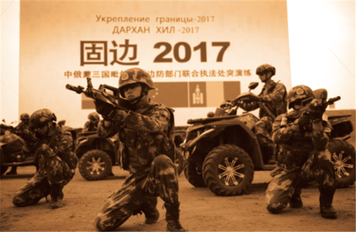 【中俄蒙三方“固邊—2017”的聯(lián)合執(zhí)法處突演練】 8月24日,內(nèi)蒙古自治區(qū)邊防總隊(duì)與蒙古國(guó)邊防總局司令部、俄聯(lián)邦安全總局后貝加爾斯克邊疆區(qū)邊防局,在內(nèi)蒙古自治區(qū)滿洲里市近郊舉行代號(hào)為“固邊—2017”的聯(lián)合執(zhí)法處突演練。采取“實(shí)兵、實(shí)裝、實(shí)彈、實(shí)爆”,演示中俄蒙三國(guó)毗鄰地區(qū)省級(jí)邊防部門口岸和邊境要道查緝、聯(lián)合邊境踏查、邊境設(shè)伏、直升機(jī)火力阻截、無人機(jī)偵查打擊、處置劫持人質(zhì)事件、樓房突入戰(zhàn)法、車輛特技追擊、野外捕殲等10余個(gè)實(shí)兵演練科目。中方境內(nèi)演練部分共投入兵力120余人、直升機(jī)1架、裝甲車5輛及頻率干擾儀、拆彈機(jī)器人、攻擊無人機(jī)等各類特種裝備40余部。期間,先后成功舉行3次聯(lián)合演練、5次三方會(huì)談,43次與俄、蒙通過信函往來、國(guó)際電話溝通聯(lián)絡(luò),共同簽訂《演練合作計(jì)劃》和簽署《聯(lián)合執(zhí)法處突合作紀(jì)要》,參觀了聯(lián)合演練指揮部、總隊(duì)國(guó)際執(zhí)法合作成果展和執(zhí)法執(zhí)勤警務(wù)裝備展。演練全面實(shí)現(xiàn)“雙邊合作”向“三方聯(lián)動(dòng)”的歷史性轉(zhuǎn)變,提升三方打擊跨境犯罪、恐怖主義和維護(hù)邊境地區(qū)安全穩(wěn)定及服務(wù)經(jīng)濟(jì)社會(huì)發(fā)展的能力。