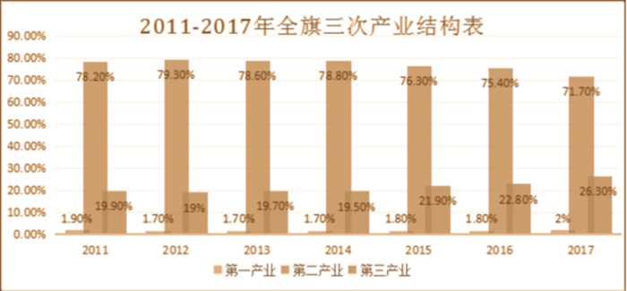 2017年,鄂托克旗地區(qū)生產(chǎn)總值425.5億元,比去年增長6.8%。分產(chǎn)業(yè)看,第一產(chǎn)業(yè)完成增加值8.5億元,同比增長3.8%;第二產(chǎn)業(yè)完成增加值305.0億元,同比增長7.0%。其中:工業(yè)完成增加值274.11億元,同比增長8.7%;建筑業(yè)完成增加值30.92億元,同比下降5.4%;第三產(chǎn)業(yè)完成增加值112億元,同比增長6.5%。三次產(chǎn)業(yè)增加值比例調(diào)整為2.0∶71.7∶26.3。
