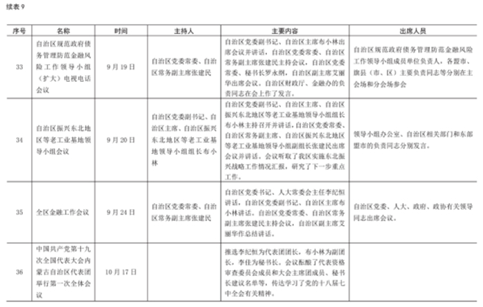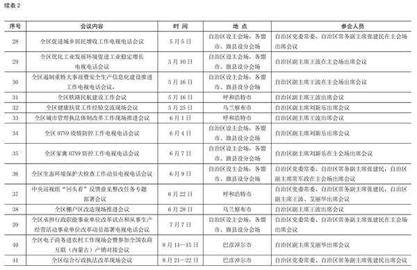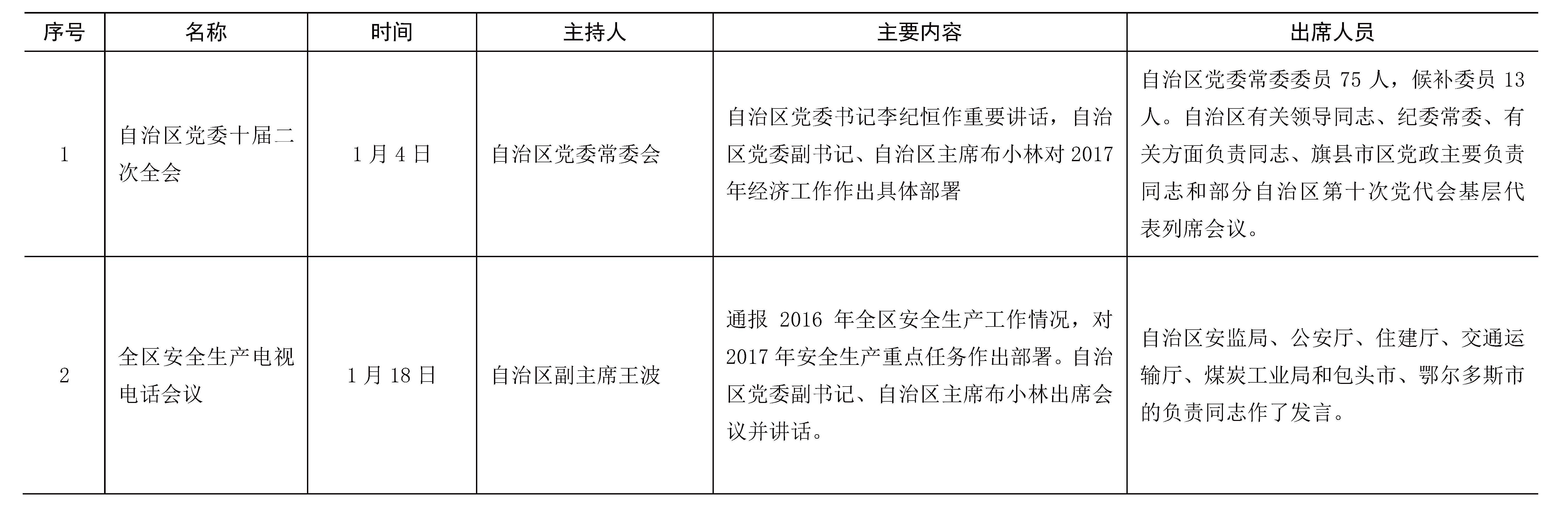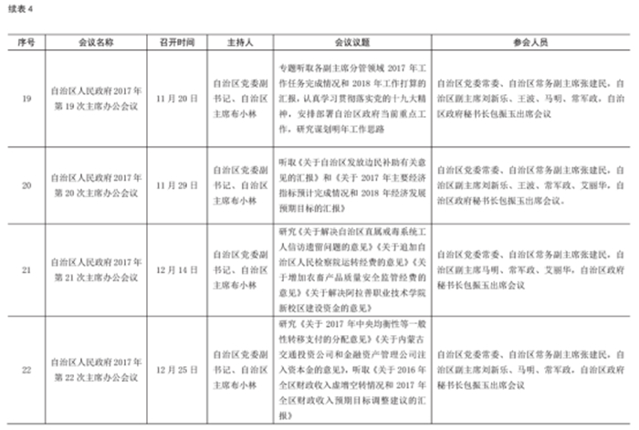 2017年,共召開政府常務(wù)會議19次,主席辦公會議22次,政府工作會議44次,其他重要會議40次。 全年,自治區(qū)主席共出席重要活動92次。