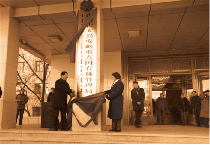內(nèi)蒙古大興安嶺重點(diǎn)國(guó)有林管理局正式成立。自治區(qū)黨委副書(shū)記、自治區(qū)主席布小林(右),國(guó)家林業(yè)局局長(zhǎng) (左)出席揭牌儀式