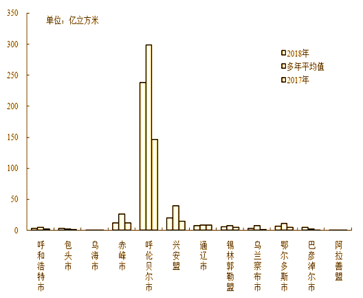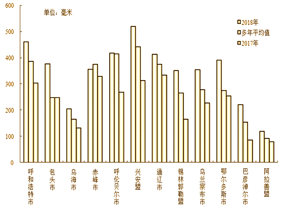 2018年內蒙古自治區(qū)平均降水量328.2毫米,折合降水總量3796.43億立方米,較上年增加57.6%,較多年平均值增加16.3%,屬偏豐年份。