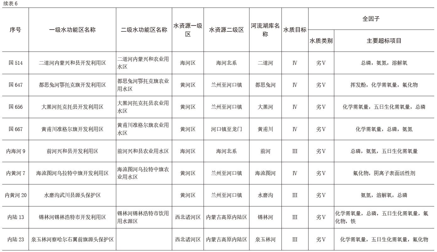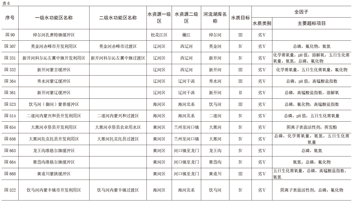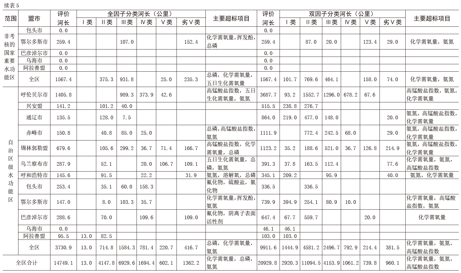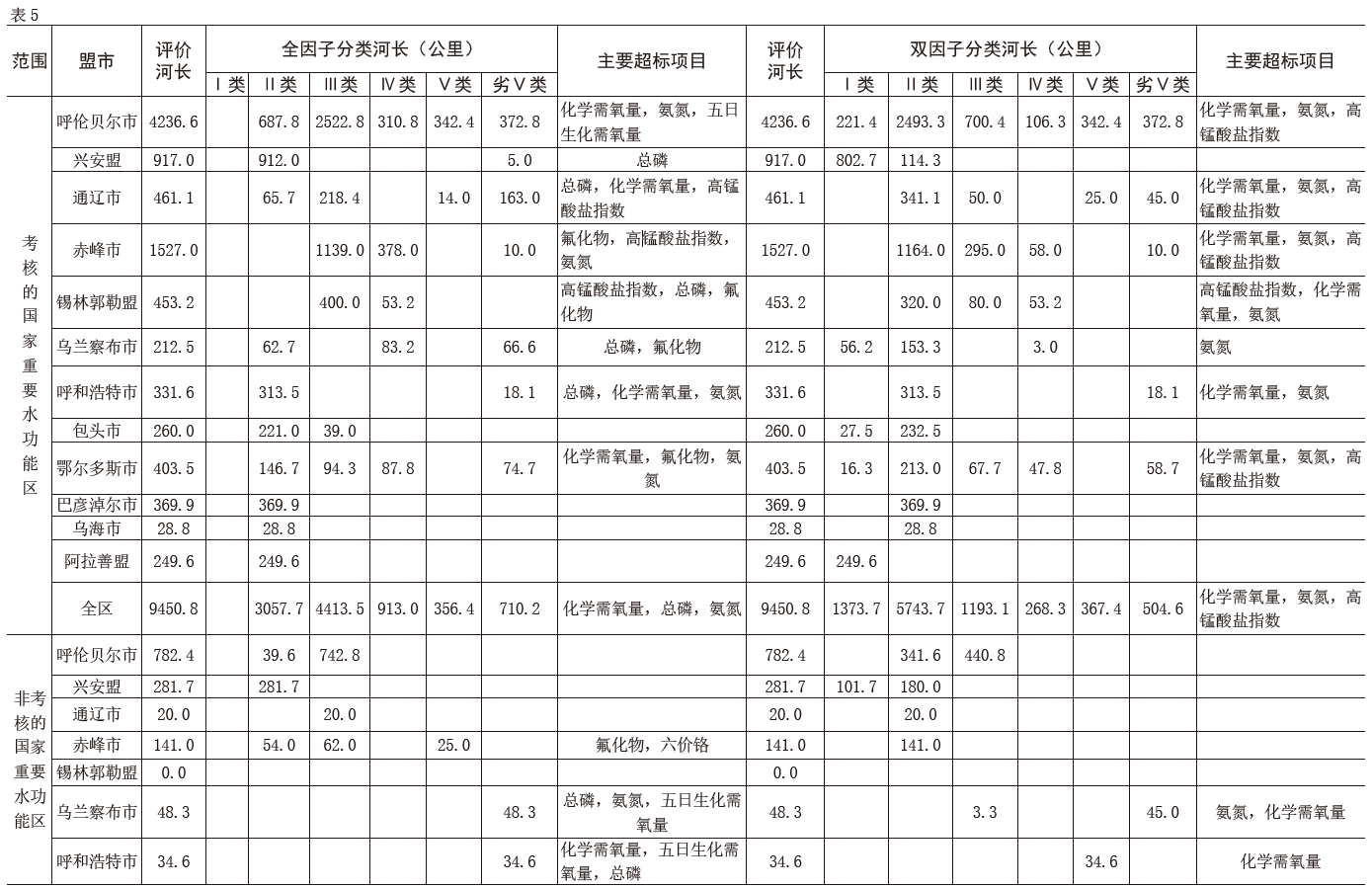 注:表5中自治區(qū)級水功能區(qū)根據(jù)監(jiān)測方案,有些水功能區(qū)只監(jiān)測雙因子,不監(jiān)測全因子,故河長和超標項目不一致。