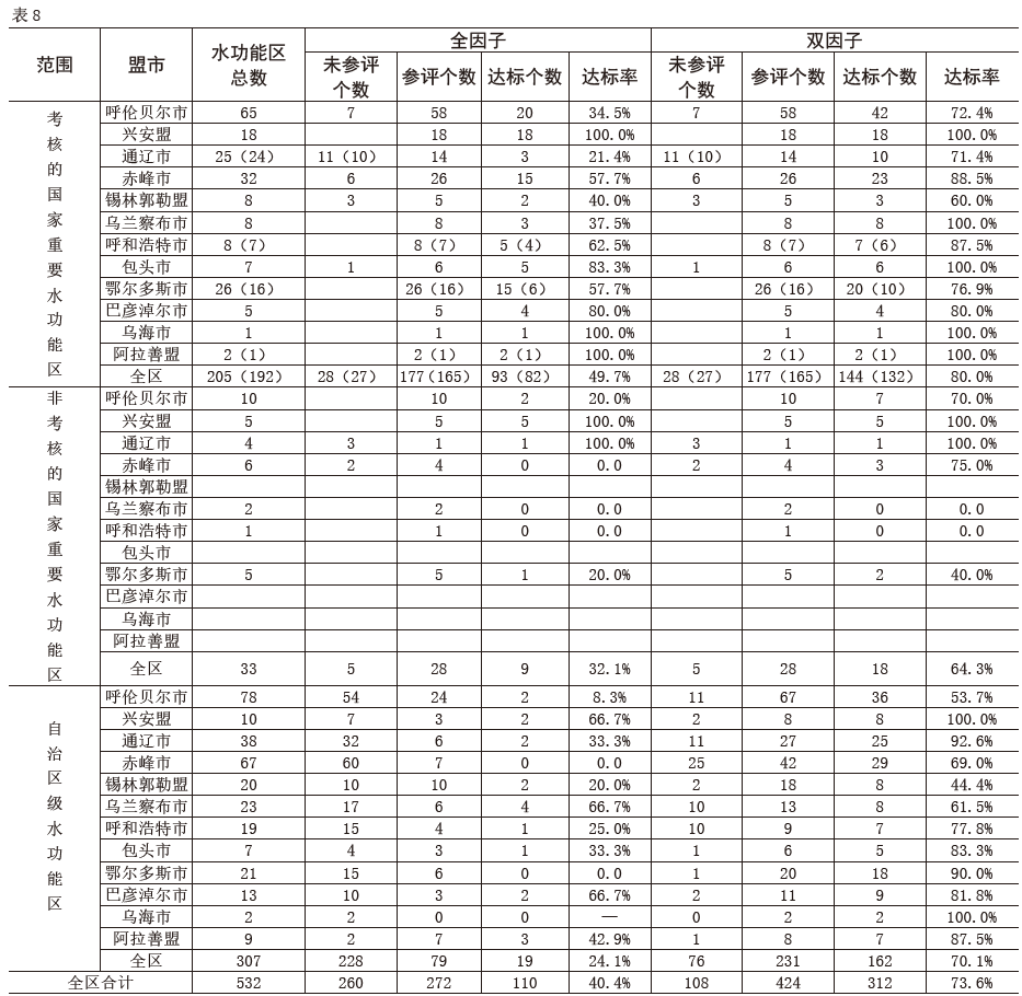 自治區(qū)級水功能區(qū)達標率情況為:興安盟、烏海市為100.0%,通遼市為92.6%,鄂爾多斯市為90.0%,阿拉善盟為87.5%,包頭市為83.3%,巴彥淖爾市為81.8%,呼和浩特市為77.8%,赤峰市為69.0%,烏蘭察布市為61.5%,呼倫貝爾市為53.7%,錫林郭勒盟為44.4%。見表8。