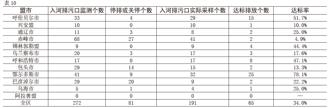 非考核的國家重要水功能區(qū)達標率情況為:興安盟、通遼市為100%,赤峰市為75.0%,呼倫貝爾市為70.0%,鄂爾多斯市為40.0%,呼和浩特市、烏蘭察布市為0。見表8。