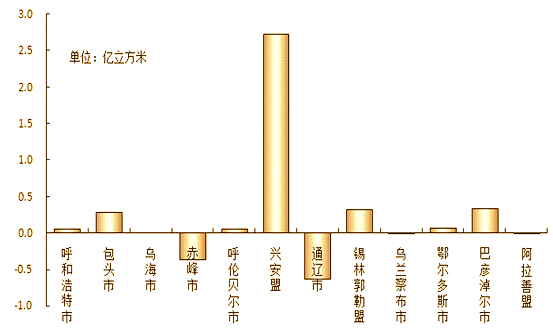 按行政分區(qū)統(tǒng)計,赤峰市和通遼市年末蓄水總量較年初分別減少0.37億立方米和0.63億立方米,呼和浩特市、包頭市、呼倫貝爾市、興安盟、錫林郭勒盟、烏蘭察布市、鄂爾多斯市、巴彥淖爾市年末蓄水總量較年初分別增加0.06億立方米、0.29億立方米、0.06億立方米、2.72億立方米、0.33億立方米、0.01億立方米、0.07億立方米和0.33億立方米。