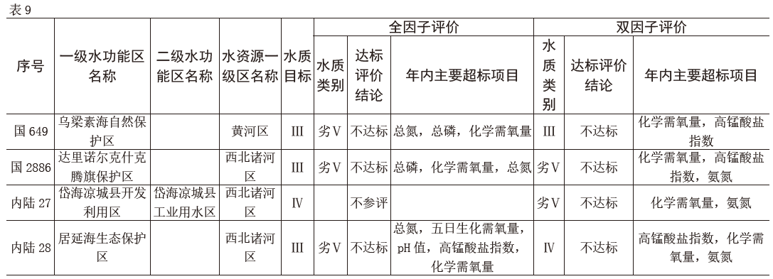 按雙因子評價:烏梁素海自然保護區(qū)全年水質為Ⅲ類,汛期水質為Ⅲ類,非汛期水質為Ⅲ類,主要超標項目為化學需氧量,高錳酸鹽指數(shù);達里諾爾克什克騰旗保護區(qū)全年水質為劣Ⅴ類,汛期水質為劣Ⅴ類,非汛期水質為劣Ⅴ類,主要超標項目為化學需氧量,高錳酸鹽指數(shù),氨氮;岱海涼城縣工業(yè)用水區(qū)全年水質為劣Ⅴ類,汛期水質為劣Ⅴ類,非汛期水質為劣Ⅴ類,主要超標項目為化學需氧量,氨氮;居延海生態(tài)保護區(qū)全年水質為Ⅳ類,汛期水質為Ⅴ類,非汛期水質為Ⅲ類,主要超標項目為高錳酸鹽指數(shù),化學需氧量,氨氮。