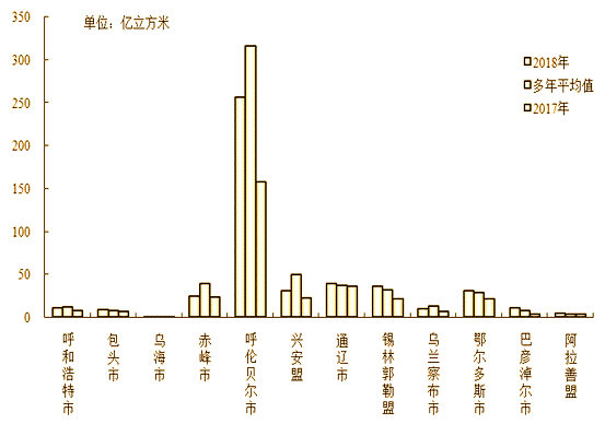 2018年內蒙古自治區(qū)平均降水量328.2毫米,折合降水總量3796.43億立方米,較多年平均值增加16.3%,屬偏豐年份。全區(qū)地表水資源量302.35億立方米,折合年徑流深26.1毫米,較多年平均值減少25.6%。全區(qū)地下水資源量253.59億立方米,較多年平均值增加7.4%。全區(qū)水資源總量461.52億立方米,較多年平均值減少15.5%。