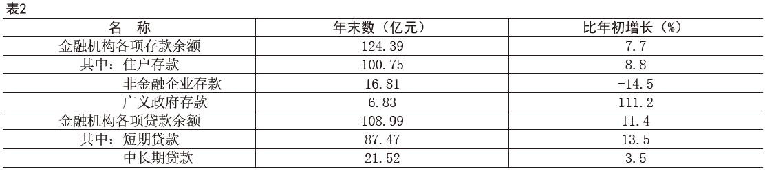 【金融業(yè)】 年末,全旗金融機構(gòu)各項存款余額124.39億元,同比增長7.7%。其中,住戶存款100.75億元,同比增長8.8%;非金融企業(yè)存款16.81億元,同比下降14.5%;廣義政府存款6.83億元,同比增長111.2%。全旗金融機構(gòu)各項貸款余額108.99億元,同比增長11.4%。其中,住戶貸款87.47億元,同比增長13.5%;非金融企業(yè)及相關(guān)團體貸款21.52億元,同比增長3.5%。