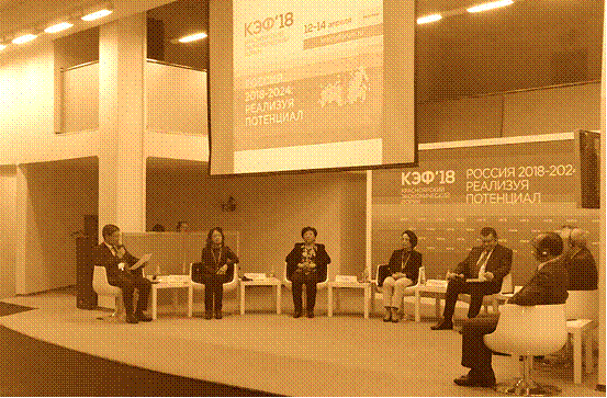 商務廳副廳長斯慶(左一)在克拉斯諾亞爾斯克經濟論壇會議上作主題發(fā)言(彭海霞 提供)